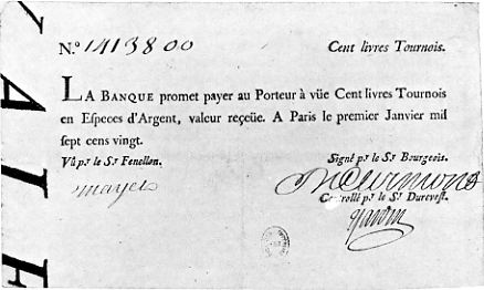 John Law, économiste et aventurier écossais, introduisit pour la première fois en France la monnaie papier sur une grande échelle sous la Régence de Louis XV en 1719-1720, en remplacement des pièces d'or et d'argent (les premières devant être totalement supprimées) - le "système de Law".